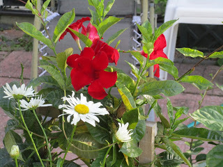 The last photo down places the white Shasta daisies in front of some big red blossoms. The Shasta daisies growing in various gatherings in the front and side gardens. Here they set off the brilliant deep red of a hibiscus called the Mandeville Rose, an annual.