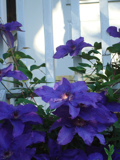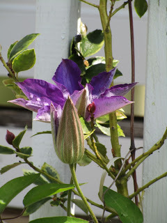 Now that the warm spring weather has come, drawing mature growth from the plants I associate with the end of May, I’m really worried that time will go by too fast and we’ll miss too much. For the first time since our move to Quincy and the beginning our perennial garden there, Anne and I have gone away on vacation during the heart of the growing season in the northeastern part of the United States. Other years we’ve taken vacation trips that remove us from home for a week or two in late winter or early spring. We’ve gone to Lebanon, where Sonya lives, in February, March, early April two years ago, and on our first trip in October, when it felt like summer there but not oppressively (not far from July in Massachusetts). So this time is different. We left last Friday on the day the first of the clematis blooms opened (top photo), just enough to reveal its pointed-star shape. We have two plants of this viney climber that gives the front of the house a small town rural look in late May.
