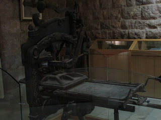 St. Anthony of Quzhaya is one of the oldest monasteries of the valley of Qadisha (located in the Mount Lebanon range in the northern part of the country), and several hermitages attached to it date back to the 12th century AD. Today visitors can tour these places, including a library, hermitage cave, and a cave-like museum that houses, among other treasures, a 16thcentury printing press that printed a Bible in the Syriac language to escape the notice of Ottoman authorities (second photo). We encountered this ancient black-metal printing press and a sample of its work in a alphabet using diacritic marks I’ve never seen before – not Hebrew, not Greek, so quite possibly Syriac -- on our tour. We also found huge urns of amphora design, with big handles on each side for carrying, that looked to me like something from 1000 BC when that design was common throughout the Mediterranean. The wall caption, however, stated they date only from the 18th century AD. Some parts of the world change more slowly.
