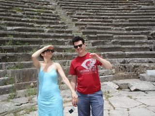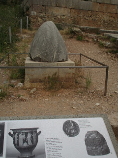 The Oracle's site, regarded as the 'center of the world,' was concretely symbolized by an elliptically shaped stone called the 'omphalos' (third image down). This site of the world navel was supposedly determined by Zeus's release of two eagles from opposite ends of the earth. Where they met was the center. The site also includes a stone theater in the round, where the plays of Sophocles were performed (last photo; not, however, Sophocles). A small temple-like structure, called the Treasury of the Athenians is regarded as the best preserved building. The history here is important, since this monumental building carried the gifts from 5th century Athens to commemorate either the fall of a tyrant and the establishment of Athenian democracy, or the victory over the Persians at the battle of Marathon that made the city's self-government possible. Either way, ground zero for Ancient Greece. Located about a two and a half hour drive from Athens, Delphi was the heart of the birthplace of the Western civilization. Prophecy is not central to modern, or monotheistic religions. But it is revealing that the civilization that birthed philosophy (the 'love of wisdom'), theater, naturalistic art, and natural science, and self-government among its gifts to a rational, humanistic way of life -- rather than superstition and tyranny -- sought to connect at its deepest levels with some power beyond the mind of man. To divinity. The gods. An oracle.