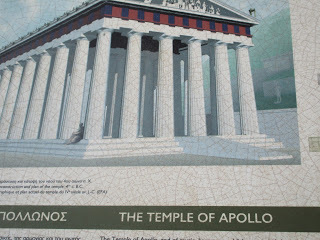 Alexander asked the Oracle whether he would achieve victory in a coming battle. When the priestess charged with interpreting the ravings (or babblings? drugged incoherence?) failed to produce a clear reply, he dragged her by her hair until she shouted, "You're relentless!" OK, Alexander (on the way to being 'Great') concluded, I've got my answer. We explored the remains of Delphi last week, viewing the site of the Temple of Apollo (top photo), the still viable theater in which the tragedies of Sophocles were performed, and then climbing up to the "stadium" where the athletic games were held. No Oracle or priestess takes questions at Delphi there any more. The rise of Christianity eventually put an end to the practice some time in the 5th century AD. Just as well; I wasn't sure what to ask. The Oracle at Delphi was in many ways the center of the ancient Greek world. Compared to the 'body' of monuments, sanctuaries, memorials, and 'gifts' erected at Delphi in its long-ago heyday, the remains are skeletal. Petitioners and visitors climbed to the site to query the Oracle, or spectate at the celebratory "Pythian Games," along a sometimes steep route called "The Sacred Way." Messengers sent by the powerful to make their inquiries -- almost any important decision of state was referred there at one time -- but also business opportunities, law suits, marriage decisions, and who to back in the 800-meter at next year's Olympics -- climbed the Sacred Way, along with the great names of the era we remember. Alexander. Socrates. Buildings and statues were erected along the way to honor, or placate, the God Apollo. In the cabinet of the gods, Delphi was in his department. Apollo had a large brief; he was the god of the sun, but also the god of music; and later was chosen to symbolize a cool, rational, orderly manner of thought. A tough man in a negotiation. His arrows put an end to frivolous suits. Of these ancient buildings only the stone footings remain along with various inscriptions valuable to scholars as 'authentic' texts of their period. The Roman stoa (a roofed colonnade) was added in somewhat later times to serve as a convenient market place for trade. Shops sold what we would call 'souvenirs' -- votives and momentoes. (Second image.) The home of the oracle was the Temple of Apollo, a huge rectangular structure the size of the Parthenon, of which only the columns on one of the shorter sides remain (fourth image, drawing). The Oracle -- the name given to the prophetess who was given hallucinatory herbs in order to see the future and produce some words of guidance, however vague, ambiguous or merely nonsensical -- was housed in a 'sacred' chamber at the room's far end. Here words were interpreted by priests.