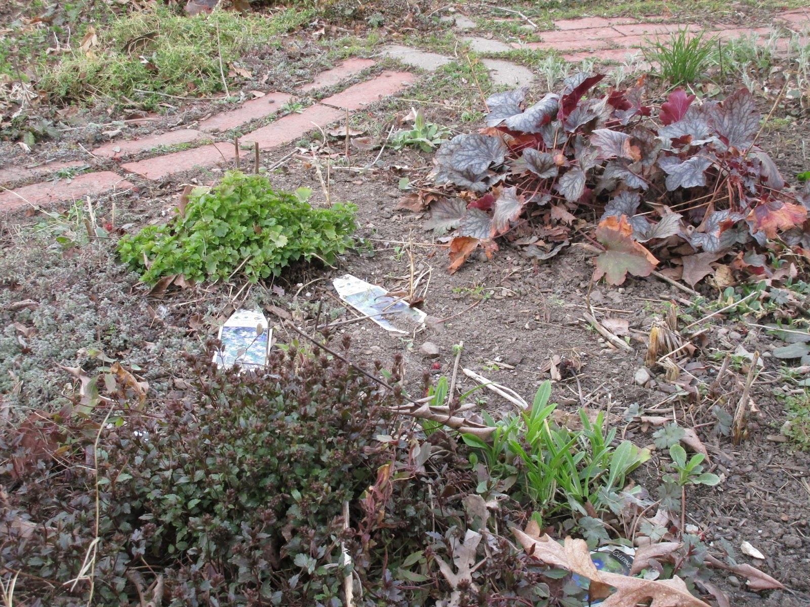 Three prominent perennials in the next photo. Lower left is the speedwell. Center, closer to the bricks is one of the varieties of Campanula (little bells) I've planted in recent years. This one shows up for business every year. To its right the purple-leafed coral bells, which fare so well in partial sun. The definition of this back garden is partial sun.