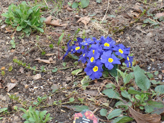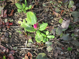 A couple of primroses, one with red blossom opening. Can't remember if this variety is the so-called English or so-called Japanese primrose. It's probably fighting for space, water and nutrients from a crowd of neighbors all of which will ultimately o'ertop it. But in April it will win the local beauty contest.