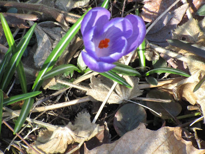 Let's start somewhere. Crocuses are winter flowers. We want to see them in early sick-of-winter March, if not February. You don't see them if the snow cover is heavy. If it's light, or just a dusting, they pop right up through it. We had one of those semi-serious March snows a few weeks ago. It was melting away by sundown on the same day it fell. The next day one final crocus emerged, so I took its photo and put it here.