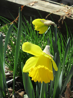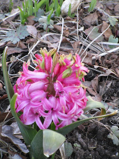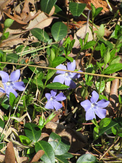 Hyacinths (below) are one of my favorite bulbs. They make a good show and they'll bloom reliably for years, even without any special attention. The flowers of the vinca minor (right) love the first sunny days of March. They're not put off by a lot of dead leaves, broken stems, fallen branches twigs, acorns, the predations of squirrels. In some woodland areas they'll carpet the forest floor, thick as a medieval tapestry with an elaborate pattern. They're an allegory for growth, persistence, annual renewal. A daffodil or two arrives in the herb garden, stealing a march on the edibles. I don't remember putting it there. Someone should interview the squirrels.