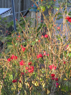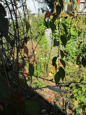 After the leaves come down, it's time to appreciate what we have. Something new, something revealed, something gained when something old and beloved is lost to time: the product of the spinning earth. Cleared views, brilliant sunsets, plenty of blue water. The leaves don't come down all at once. Some trees and shrubs turn in stages, giving us the contrast of darker and lighter colors. Their numbers thin and we peer between half-bare branches at the shapes and colors revealed behind them. When a young, enthusiastic maple tree, a volunteer that rose beneath the shelter of the big oak in our back garden, released is leaves last week, a new and brighter carpet covered one portion of the garden, a place that catches the angled rays of the morning sun. The sun on the leaves turn mid-morning a canary yellow.