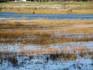 The water was high in the marsh the last couple of weeks. At intervals the city decides -- at least I assume (and rather hope) that this is a conscious choice -- to open the flood gates a bit more and let the marsh fill with water from Quincy harbor to a height that nearly drowns the spartina grass. Against the blue of the sky and the blue of the water, the grasses show their own waves of golden tints of amber and ochre and saffron. Waves of color ripple in the salt marsh. A special little transformation, courtesy of the lowering perspective of November sun.