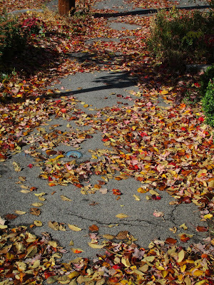 When the leaves come down it's time to look at them. All over town they're creating compositions, textures, ephemeral works of color shape, patterns, and mixtures of all these elements on the canvas of earth's surfaces. Those surfaces in densely populated ares are generally hard, impervious. But for a week or two, they'll appeal to the senses.