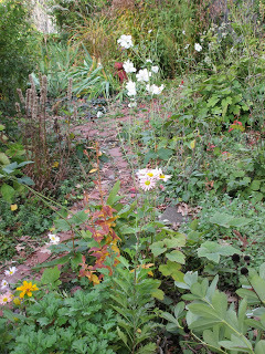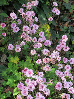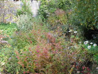 There's still plenty of green landscape on earth's surface even now, in the first footholds of November. Lawns are green, in some cases greener than have been for months because mid and late summer often stress grass, and in some cases they're spotted with the fallen leaves that, to my eye, give them more interest. The evergreens are ever as they were, though some are showing brown spots from the now-annual summer dry period (not technically a drought, but effectively one). But the deciduous tree have mostly turned. The perennials in our flower gardens have colored up, though their blossoms in almost all cases are long past. The primrose, a low scrubby, prolific plant that blooms yellow in June, turn their leaves crimson in October. The leaves of a knee-high flowering perennial called "balloon flowers" turn yellow as cheese. It's the early bloomers, first half the season, that seem to provide the most of this low fall foliage. Some of our late bloomers are still trying to bloom: a white-flowering anemone; some annuals; some mums. The Montauk daisy is interestingly caught in the middle. It's white, October-blooming flowers still hang on the stem, though they're drying and brown-spotting their petals. But the leaves, particularly on the low stems, are already turning yellow. And the beautiful, rusty, bronze and copper tones of weeping cherry tree hover over the back garden's center, like a temple to the color palette of autumn (second photo down). The lace-cap hydrangea in the front garden does something similar, offering a whole little forest's worth of variety in a shrub-sized canopy (last photo).
