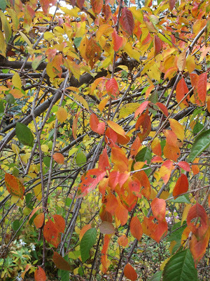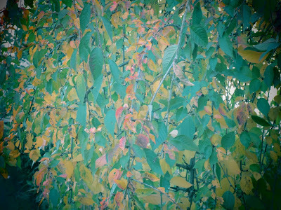 The leaves on the weeping cherry tree do their disappearing act, by stages. Some pale yellow, some bronze. Nabokov said there are a hundred shades of yellow. He must have been thinking of autumn.