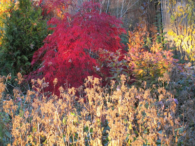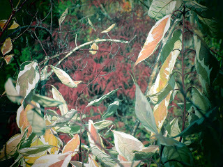 And, this week, the crown prince of autumn's color-creation, at least for intensity, is the Japanese maple, still a shrub, limited in size (having adjusted to itself to the amount of sun and water it gets from us, no longer pining for more), but not in the expression of its deep, dark, reddening heart (seen in both the top and third photo down). It's the declining sun that singes the foliage of these plants, firing them into autumn colors, as every day takes further into the deep.