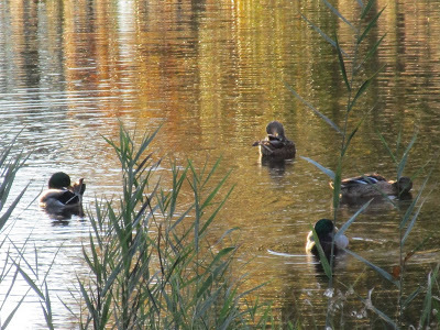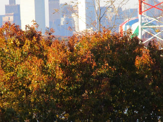 Sunset comes so early it's gone before I remember to look at it. On the way to the golf course there's a tiny pond just big enough for a quartet of ducks to spin around one another in circles. Go a couple hundred feet farther and the city skyline rises up above the November treeline. Back home, the Japanese 'red' maple delivers on its promise.