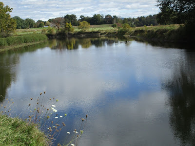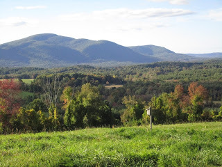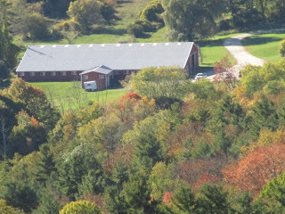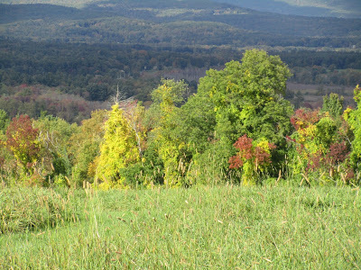 In our yearly visit to this area, the homeland of autumn in the annual calendar of our lives, we returned, like a migratory species, to the favorite places we visit each fall. The blue river in the second photo is the slow-winding Housatonic River that coils through the Trustees of Reservations property named Bartholomew's Cobble in Sheffield. At the end of a tour of the cobble (a low, thickly wooded hill featuring limestone walls with shallow caves), the path along the river, a good stare up at the second oldest cottonwood tree in the state of Massachusetts, a hike through a wooded path named after a singular tulip tree (not sure how high in the charts this tree rates), we confront a long, gentle ascent through a green pasture to the top of Hurlburt Hill. From there we have a view of the Berkshire hills to the north, east and west (third photo down). October is migratory season for hawks. We always see some floating on the warm updrafts from the sun-warmed hills.