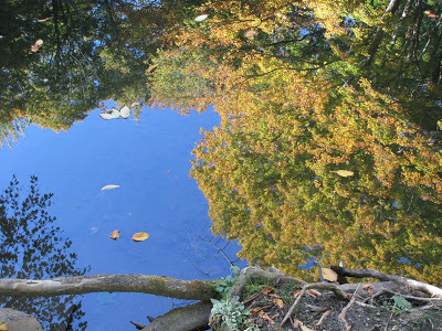 From there we hike to "the little pond" that stands as our icon for autumn peace. The pond has suffered incursions by beavers, who dragged some downed tree trunks and branches for a lodge that failed. And the water was low this year. But the surface still gives beautiful reflections of October trees (seventh photo).