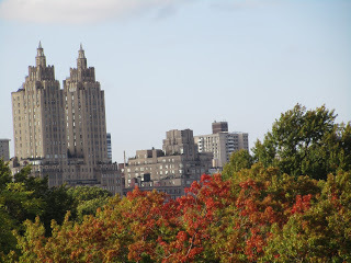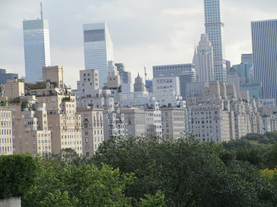 But they could not however provide us a parking space. If you need to park a private vehicle on the streets of New York City, what you are likely to experience is endless driving, or crawling along residential side streets, eyeballing how close you are to that hydrant, or this driveway, and deciding almost always you're too close for parking. So we give up and head for the parking garage only to discover it closes at 11 p.m. and we are now gated out. In the end, following our host's reluctant suggestion, we park on a leafy corner next to a partially obscured "no parking" sign (see photo above). In the morning (early) Anne is greeted by a summons from the killer New York parking gestapo. In that same "safe," "desirable" residential neighborhood, now on foot, we encounter the barking-cop voice at the traffic signal's walk light. When the light is red a recorded voice shouts an angry-rude New Yorker "Wait!" "Wait!" every ten seconds or so, reducing an otherwise peaceful public space to a crowded hallway of unruly first graders. Is this what keeping the peace has come to in "fun city"? City buses also have recordings where a male cop voice shouts "no"-this and "no"-that a half dozen times at every stop. On the other hand, the buses run regularly enough to be useful (more than you say for most other cities). Well, of course, lots of good to report as well. Autumn in New York is beautiful, in part because any threat of a sweltering, humid, urban-jungle weather day is now likely past. You can walk around comfortably and enjoy the urban texture of mid-town, townhouses with expertly wedged landscaping and floral color, leaves turning, the dense and varied street scape, the dramatic skyline, and the nonstop diversion of a lively parade of humanity down every avenue. We walked along Central Park to the Metropolitan Museum of Art, and eventually made our way up to the newly opened Roof Garden... where the views are, simply, exhilarating (top three photos). This was the spectacular part of the day. As the song says, unexpected pleasures of "Autumn in New York" such as these make you feel good to be alive. We'll leave the last lines to Billie:"Its autumn in New York, its good to live it again.Autumn in New York, the gleaming rooftops at sundown