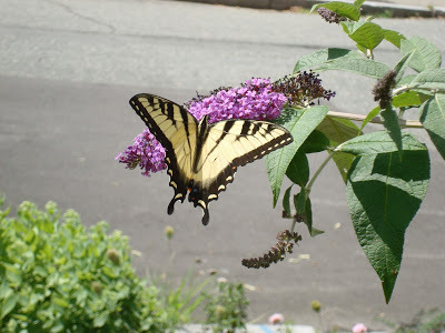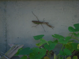 The article also tells us they should be called "praying mantids" even though the genus they belong to is "mantis." In addition to the elongated thorax, formidable front legs (bent to an ankle suggestive of "praying"), and their two large compound eyes -- which, I can testify, give a convincing impression of looking straight at you -- their heads can swivel a full 180 degrees, like some robotic humanoid. Indeed, I suspect when the insect kingdom replaces hominids as the dominant life form in the unknowable future of planet earth, some of them will look like your boss and behave like aircraft carrier flight controller, scanning the friendly skies. The National Geographic notes how well camouflaged these formidable hunters are as they "lie in ambush or patiently stalk their quarry." Their reflexes are so fast they can be hard to see with naked eye, but again, drawing on personal observation, I have seen one strike but miss catching a honey bee. On the other hand, maybe he didn't really want to catch it when he saw what he was hunting. The praying mantis's lower legs have spikes for holding on to what they do catch, the article tells us, while their jaws go after the tastier parts. "Moths, crickets, grasshoppers, flies, and other insects are usually the unfortunate recipients of unwanted mantid attention." In our case, the unfortunate victims are butterflies. The large mantises that stalk our garden disguise themselves as a green and brown leaf hanging from the upper branch of a butterfly bush (bodelia) in the front garden, directly below a purple blossom (see top photo). It somehow knows that this is the place the butterflies like to hang out. We have seen Monarch butterflies rest here for hours. So, last month when I happened to glance in that direction and noticed the wings of a black butterfly flapping wildly from side to side I guessed what had happened and arrived on the scene like the cavalry, or some oversized air-rescue unit. Those formidable "preying" front legs had latched on to a wing while the butterfly struggled to escape. I noticed however that the butterfly -- it resembled a swallowtail -- still kept its head. (Literally). Unable to think of anything better, I swatted at the mantis, and both predator and pray fell from the branch into the thick ground cover. Camouflage hid the mantis from sight, but the black winged butterfly was lying in clear sight on a mound of thick Vinca leaves. So I picked up the butterfly, which made no attempt to fly and permitted me to carry it into the back of the garden far from the scene of the crime. I noticed a small tear in one of his wings. I decided to set the butterfly down on top of a thick stalk of another plant (a tall phlox) and hope that he could recover unmolested there. Or not. I am not really god of the garden insects. A few hours later when I went out to check on him the butterfly was gone. I took this absence as a favorable sign. I will conclude with some lines from the poem I wrote about another episode, when I caught two praying mantises in flagrante on that same bush. (Apparently; who really knows? I mean, they're insects.) Too big for squeamish hands to touchtoo raw for greenleaf thoughts of preservation too distinguished in its regicidal enormity to ignorethough its body swims metamorphically into the green and brownof everyman's little spot of paradise