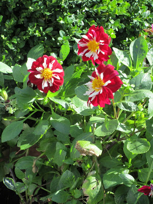 And, of course I've had a lingering cold all week. Nevertheless, a fond look back at -- well, just a matter of days ago. All that watering, especially in plants condemned to grow in pots, their roots imprisoned, enabled some of the annuals to keep flowering. In the top photo posted here, we have dahlias with red and yellow blossom.