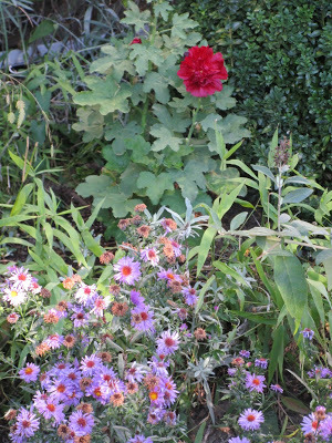 A hollyhock with a deep red blossom (second photo). A new perennial, which I picked up after seeing one at a friend's house that grew nine feet tall before the flower spike was cut in half by a gust of wind. In the foreground of the photo, some violet asters that flowered nicely in September and are now beginning to fade.