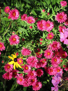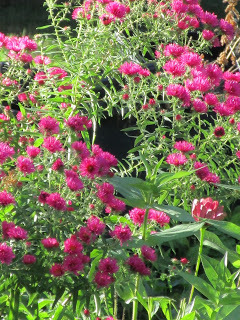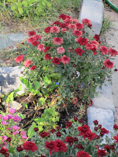 Some hardy mums planted last year against a low wall. (Fourth photo down.) A tall red aster, the most colorful of all the plants still blooming (seen in the third photo down and also at the end of the column). This one was given to us a couple years ago by neighbors. The last of the yellow Black-eyed Susans, a staple bloomer over the last three month, is seen in the top of the two red aster photos.