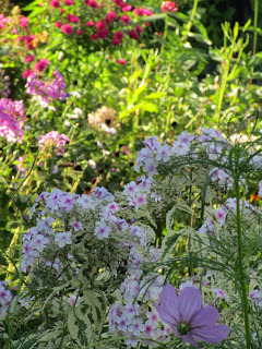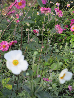 Some white flowering anemone show with the dark pink ones behind it (fifth photo down). A photo of various flowering plants with a tall phlox that gives white blossoms and pink centers dominating in the foreground (sixth photo down).