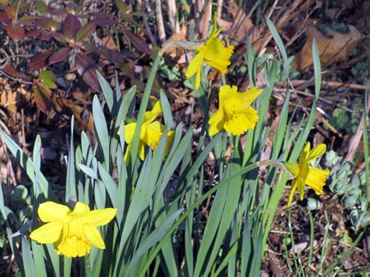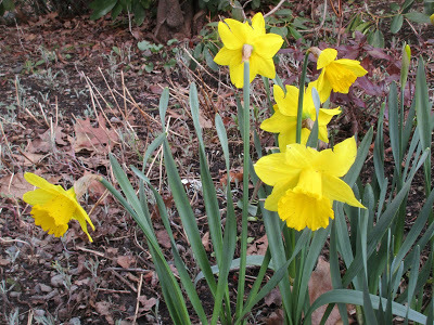 The first daffodils break the ground and then bloom with signs of the winter still around. Leaves on the ground, dried stalks from perennial shrubs, as seen in the top photo. I enjoy looking at plants in situ, especially if that 'situ' -- situation; surroundings -- is a little wild.