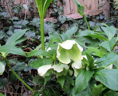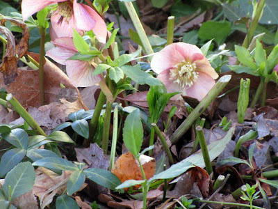 Crocus, the famously early starters among the common bulbs, are shown in a photo blooming against a curbstone. Others bloom among the dried oak leaves we haven't managed to clear yet. Another classic early bloomer is the Lenten Rose (hellebores), the fourth photo down.