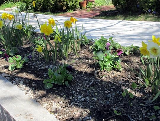 Today, as I look around, they are. I found other flowering weeds -- another world for wildflowers whose names I do not know -- and added them to the mix. I added in some newly prominent, suspiciously prevalent, fast-growing plants -- I suspect them of being invasives.... but these, joined with violets and daffs will do for spring color.