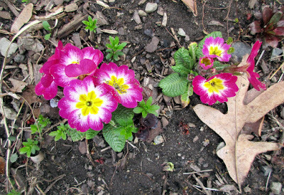 There's nothing very wild about living in Quincy, Mass. But if you give nature even a little space, things happen, as in the second photo, Japanese primrose. The plant blooms very early, because they're very small. This photo exaggerates their size... But early in the season they have space to get the light they need to bloom, because the perennials that grow up higher and crowd this space haven't begun growing yet; man of them haven't even sprouted. The primrose have their close-ups surrounded by bare ground and the dross of last winter.