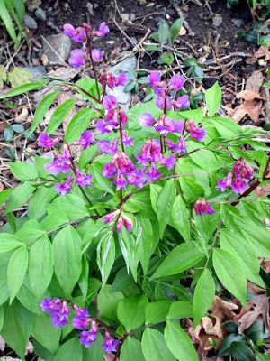 In the front and backyard gardens, dried leaves and wintry grasses give way to new greens: and to the Japanese Primrose in the top photo on this page; the reliable spring bloomer Bleeding Heart; the Hellebores (Lenten Rose); and in the final pic at the bottom of the page with the oddly delightful name of Spring Vetch.