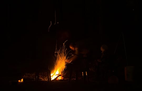 A 0.5second exposure, steadied by a tree, of our campfire from last night. I like how the sparks fly and how the chaotic drafts from the fire move them. Mostly upwards, but sometimes in circles.