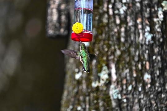I took these images with my Sony A7III using the 600mm lens at f6.3, 1/800s, and 2000 asa (equivalent speed). The trick is to sit in a chair and wait. If they’re spooked move further away, and then after a while move closer. These birds, once they realize that you’re not a threat, become bold. They’ll buzz you to remind you to fill up the feeder, which is an interesting experience. The feed is one part sugar to four parts water by volume without added food color.