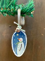 Snowman SpoonThe next ornament idea comes from my sister, Stephanie Crow. She has been making crafts and teacher others to make them for pretty much her entire adult life. If you want to add a hoey touch to your tree this year, this is a great idea. You will need a spoon, paints, a brush, some embellishments and maybe glue if you need the embellishments to stay in place.