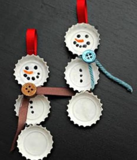 You will need some bottlcaps, paint, ribbon and/or yarn, buttons, and glue. paint the insides of the caps white. Glue them to a strip of ribbon, paint the snowman faces and buttons inside the caps, tie the ribbon or yarn around the "neck" of the snowman. Glue your button on top of the knot. Let the snowmen completely dry and then hang them on the tree. If you search online for bottle cap snowman ornament you will find all kinds of variations on this idea. some have stocking caps. Some have top hats. People really get creative with this simple project. Some even use bottle caps to make some adorable reindeer ornaments. I was trying to find who created these snowmen to link their site and give them a proper attribution, but I have not found it yet. If I do find it, I will add it in as soon as possible.