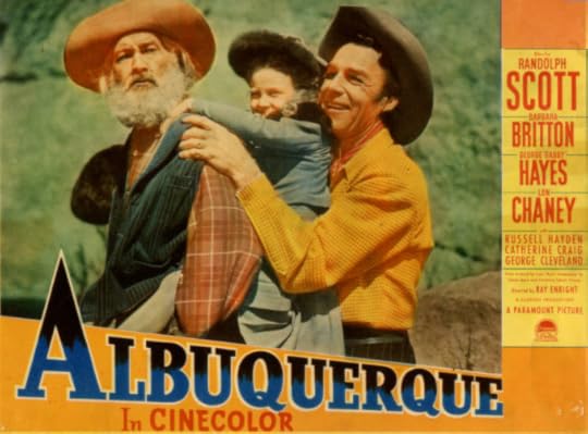 This will be short and sweet today. This movie, Albuquerque, was released in 1948 by Paramount Pictures. This western was directed by Ray Enright and stared the incredible talents of Randolph Scott, Barbara Britton, George "Gabby" Hayes, and Lon Chaney, Jr.