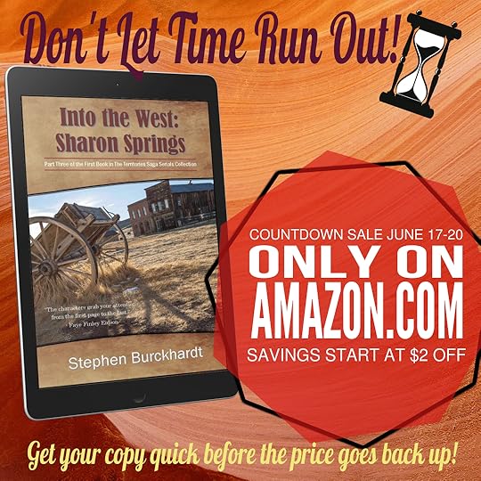 Don't forget Part Three Into the West: Sharon Springs eBook is on a countdown sale right now. Saving start at 67% off the regular price. That is a saving of $2. Hurry and download your copy today. The price starts going back up tomorrow!