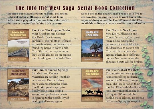 Shocking, I know! (I can practically hear my friends' and families' eyes rolling.) I have no idea how I didn't realize this before but I have a domain email address I have never used. So I have finally set up s.burckhardt@stephenburckhardt.com. I'm changing all of the email links on this website today. I hope I catch them all. But if I don't, the old email Stephen.Burckhardt@gmail.com works too. Also, I have been wallowing in despair these last few months. Not over my life, that is wonderful, but over my current lack of a writing career. I am truly at a loss. I love writing these westerns but I have yet to hit on a formula for getting more attention for them. I'm going to give it all one last push and spend some decent money to advertise part three, Into the West: Sharon Springs. I am determined to have this book out in November and push it for Christmas. I will even do a holiday tie-in with the last scene being about Elizabeth's first Christmas on the prairie and even include a few family recipes from the time period. I want this become a viable income for me so I can eventually just write but so far that is not happening. If I cannot garner any significant improvements as far as followers by the first of the year, I am considering taking a break from this serial and try writing something more mainstream, like horror, to get some income coming in. For now, I'm going to get my butt in gear and finish part three and do some serious promoting. Wish me luck!Stephen