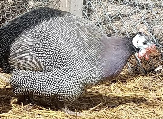 The bird has earned it. He came as one of ten guinea chicks, and remained as one of three that escaped a mink. Sickness and a raccoon whittled down the flock until Contraire was the sole survivor.