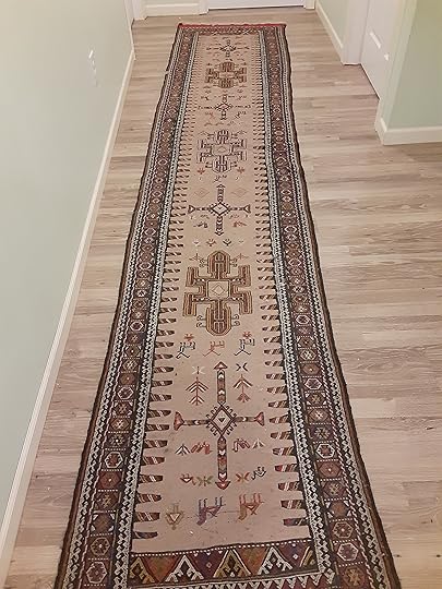 It is a woven hall runner with intricately made designs. When I turn it over to clean, I am always amazed at the tangles of knots and thread on the back. The artisans who weave kilims have an amazing skill.