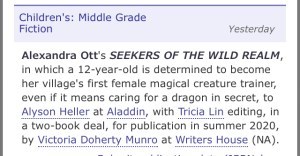 I’m so excited to finally share this news! My next book is called SEEKERS OF THE WILD REALM, and it’s the first in a new adventure fantasy series about an island full of magical creatures and the 12-year-old girl determined to be the first female magician in her village to work with them–even if it means teaming up with her biggest rival and caring for a dragon in secret. I’ve been working on this story for over a year now, and I can’t wait to share it with all of you!