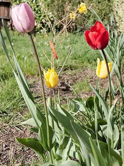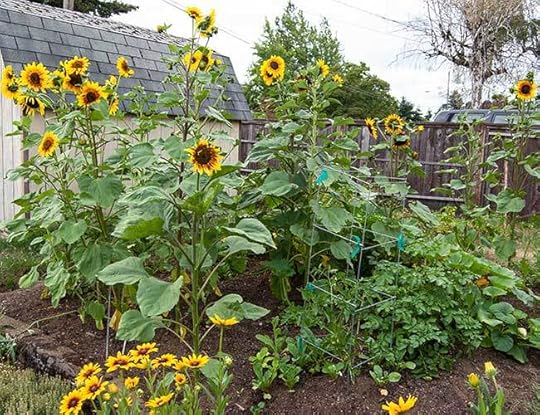 This is the current state of the garden. Should there be so many sunflowers crowding everything else out? Probably not. They are all volunteers, and I yank lots of them out. But then they get a couple of feet tall, and I feel bad, ending their lives when they will soon be happy sunflowers, so my garden is always chaos.