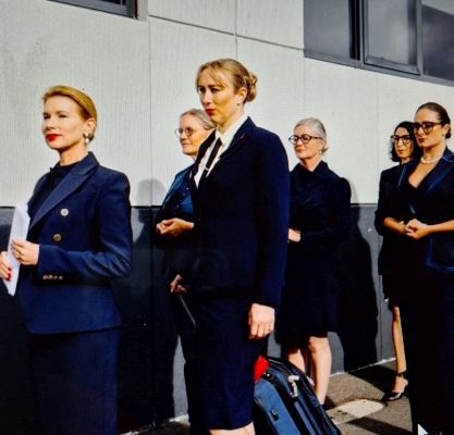 Getting back to the Hobart court case. It became a newsworthy sensation because MONA’s curator, Kirsha Kaechele framed it as a performance piece. She led a group of over 20 women into the court. They were all sleekly attired in dark business suits with pencil skirts, bold red lipstick and strands of pearls.