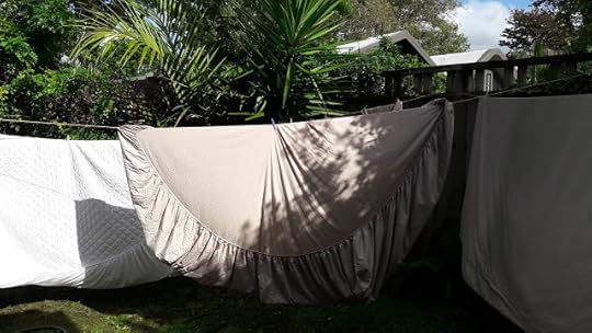 This 'master bed' load nearly killed the washing machine. Three queen-sized sheets and protectors, plus pillowcases, all wrapped around a centre piece, was nearly more than our machine could cope with. Out of respect for the environment, our machine-for-five is only medium-sized, not large.
