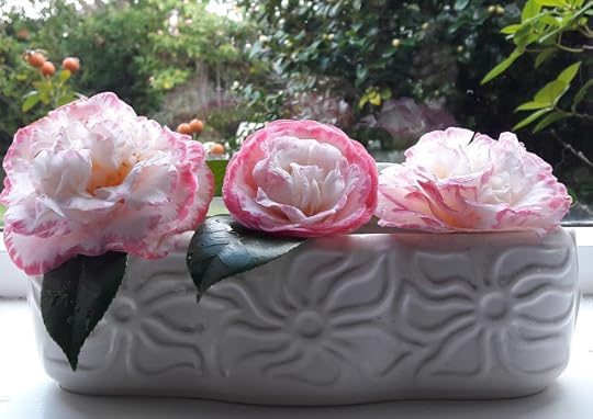 I've been meaning to bring in the new season pink-white camellias, but it took a little horizontal therapy for me to finally do it...
