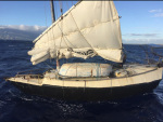 USCG public domain photo of SV Kehaar Darwin a 30-foot junk-rigged, homemade sailboat towed by the USCG on January 1, 2018, near Maui.
