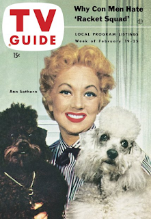This is only the eighth-oldest TV Guide in the collection at the time of writing, but today's programs include something we haven't seen before: a listing for "Test Pattern." It wasn't unusual for the test pattern to be shown at times when there was no programming on the station, oftentimes accompanied by music. I don't know if that's the case here, but I'd like to think that at least in some cases, the music came from radio stations that shared ownership with the TV station. Nice corporate synergy, if you know what I mean. Something else that's unusual about this week: we have not one but two stations that have affiliations with all four networks, and that results in Boston having two stations with CBS affiliations. Yes, it's always entertaining when we go back this far in history. Our sample comes from the New England Edition.