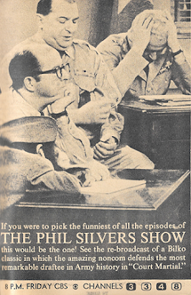 That's not the only special episode this week. On Friday, The Phil Silvers Show (8:00 p.m., CBS) presents the third airing of "the funniest of all the episodes" of the series: "The Court Martial," in which Bilko somehow finds himself defending a chimp that's been accidentally inducted into the Army. You know about the warning against acting with either kids or animals; well, someone should have let Zippy the chimp know that upstaging Phil Silvers wasn't going to be so easy. The most memorable scene of this memorable episode takes place during the court martial itself, when the chimp, going completely off-script, romps around the courtroom and picks up a telephone, eliciting laughter from everyone but the unflappable Silvers. "What are you doing," he ad-libs, "calling another lawyer?" It's a great moment, not only the funniest Bilko episode, but one of the greatest in sitcom history. No wonder TV Guide notes that "The popularity of this episode has led to this third showing." That's how things worked in this pre-DVR era.t t t