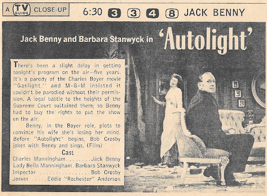 "Gun-Shy" is also not the only parody on TV this week, but you'll have to choose which one you want to watch, because they're both on at the same time. Maverick's competition is The Jack Benny Program (6:30 p.m., CBS), and tonight Barbara Stanwyck guest stars with Jack in "Autolight," a parody of the Charles Boyer/Ingrid Bergman thriller Gaslight. Before "gaslighting" became a term of political deception, it referred to the technique employed by Boyer in this movie, in which he attempts to drive Bergman insane by making her think she's imagining things; one way in which he does this is by manipulating the gas lighting to make it dim and brighten.