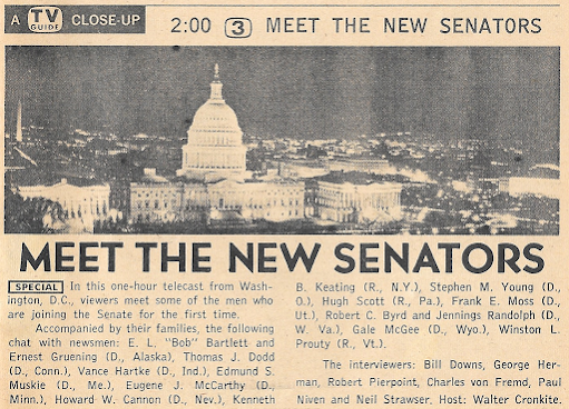 Finally, since a new session of Congress began last week, I thought this might prove interesting: Walter Cronkite hosts a one-hour CBS News special introducing our newest batch of U.S. senators. (Sunday, 2:00 p.m.) It's difficult to think the networks would bother with something like this today, but back in 1959 I suppose we were all naive enough to harbor the thought that amongst this group might be the dynamic leaders of tomorrow, like that young Jack Kennedy back in 1952. And while not all of them went on to become household names, there are a fair number you might have heard of before: a vice presidential nominee and secretary of state, an influential presidential candidate, and other assorted cabinet members and ambassadors.