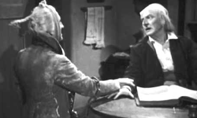 Thursday's highlight comes courtesy of CBS's showcase for spectaculars, Shower of Stars (7:30 p.m., brought to you by Chrysler and broadcast in color!) It's a musical rendering of A Christmas Carol, with a score by Bernard Herrmann, script and lyrics by Maxwell Anderson, and starring ◀ Fredric Marsh as Scrooge and Basil Rathbone as Marley, with an all-star supporting cast (including Bonnie Franklin as one of the little Cratchits). It's perhaps the most lavish version of A Christmas Carol to appear on television, and the first one anywhere to be done in color. In the good news-bad news department, there's no surviving color version of the program, but you can watch it in a B&W kinescope. If you already know how the story ends, go to NBC at 8:00 p.m. as Joe Friday and Frank Smith investigate the strange theft of the Baby Jesus from a church's Nativity scene in the annual Dragnet Christmas episode "The Big Little Jesus." t t t