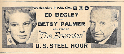 On Wednesday's U.S. Steel Hour (9:00 p.m., CBS), we're reminded that panel show regular Betsy Palmer is also an actress, as she stars with Ed Begley in "The Enemies," a predictable Romeo-and-Juliet story set in the world of small-town politics. A better bet would have been the Wednesday Night Fights, airing opposite on ABC, with future heavyweight champion Sonny Liston, currently the #9 ranked contender, taking on Howard King in Chicago. However, Liston pulled out (probably due to injury); his replacement, #2 light-heavyweight Harold Johnson, who took the fight with only six days of preparation, outpointed King to take "an easy, but unimpressive victory in the televised Chicago Stadium bout." The recorded live attendance was 625.I often mention how prominent movies used to be in the everyday TV schedule, especially when it comes to local stations and their programming; later on, you'll read about WTCN and its nightly Movie Spectacular; Thursday night, however, KMSP has to take the honors with its 9:00 p.m. showing of High Noon, the 1952 Western that won an Oscar for Gary Cooper and also starred Thomas Mitchell and Grace Kelly. Seems to me they could have made a bigger deal about having this; maybe they'd already shown it once before? One of the co-stars of High Noon was Lloyd Bridges; his hit Sea Hunt appears opposite the movie, at 9:00 on WTCN and 9:30 on WDSM. Also at 9:30 but on KROC, it's Decoy, the Beverly Garland show that foretold Police Woman.